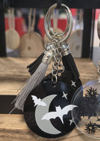 Acrylic or wooden keyrings, available in different sizes, colours and designs. The larger keyrings are clear or black acrylic, with a tassel or charm and are 5cm wide. The smaller ones are either painted wood or black acrylic and are between 3-3.cm wide. All have a metal keychain.